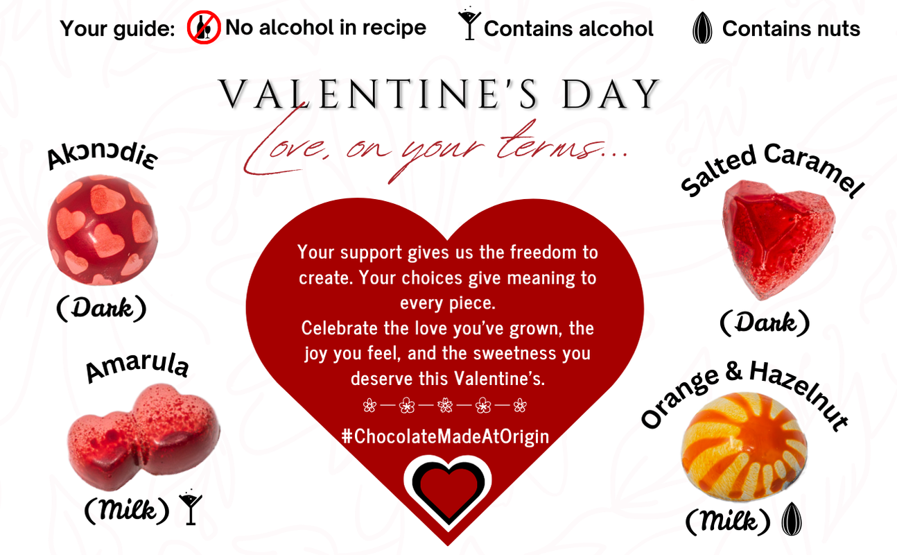 We handcraft our dark and milk chocolate desirables with chocolate manufactured in-house using traceable beans from the Eastern Region of Ghana.